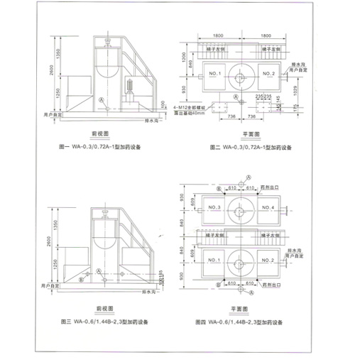 | WA系列加药设备配有一个内衬玻璃钢材质的药剂溶解槽,并配有一套电动搅拌机、二个药剂溶液箱,一套投药装置及配管、钢制平台、扶梯等组成一个整体。