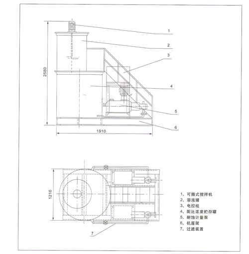 本设备为一体化装置,主要由搅拌机、溶液灌、二级过滤装置、配比浓度药液贮存灌、计量输送泵及电控柜、机座架等部件所组成。根据药性质采用多种材质及防护层,具有结构紧凑、投药系统不易阻塞、操作管理方便的特点。